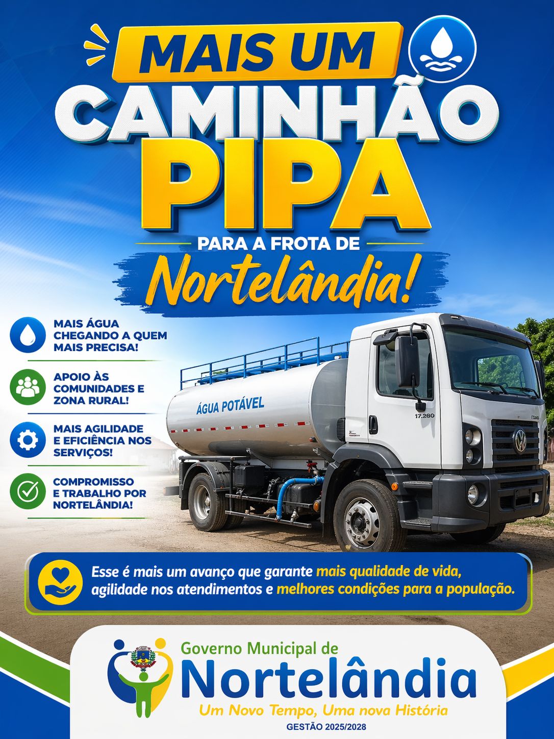 O novo veículo chega para fortalecer os serviços públicos, ampliando a capacidade de atendimento, especialmente no abastecimento de água, apoio às comunidades e ações de manutenção em todo o município.