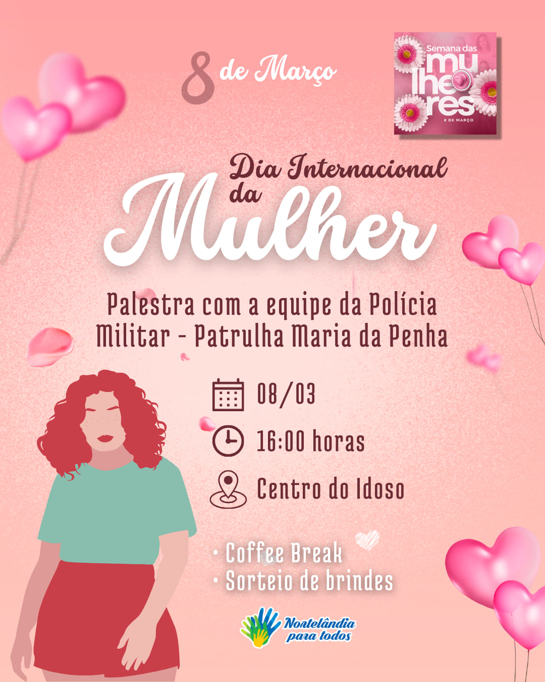 Convidamos as nortelandenses para uma importante palestra em homenagem ao Dia Internacional da Mulher! No dia 08 de março, a Prefeitura Municipal de Nortelândia vai realizar um evento especial no Centro dos Idosos, e você é nossa convidada especial!